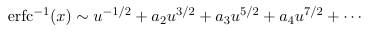 基本正規分布(平均=0, 標準偏差=1)の累積分布関数をψ(x)とする。Ackmanはψ-1(x)に対する分数式近似を作った (例えばここ)。その公式を使うと erf-1(x) が右の式で計算できる。多分こちらのほうが高精度。