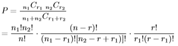 r票とおきます。そのような状況が生まれる確率Pは次式で得られます。 |