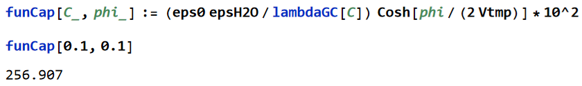 次のコードは単位面積あたりの静電容量を計算します。Cは1:1の塩のモル濃度です。0.1 mol/L で 0.1 volt のとき 257 μF/cm2 です。