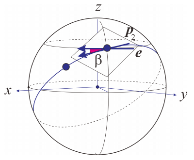 <振れ角の求め方II. 経度・緯度から計算によって> Pを撮影点(位置ベクトルa1)、Qを対象点(位置ベクトルa2)とします。位置ベクトルはΘとαから容易に計算できます。 Pにおける接線は、Pにおける接平 面(撮影者にとっては地面)に乗っていますからPにおける東西のベクトルeと接線が作る角度βが振れ角になります。