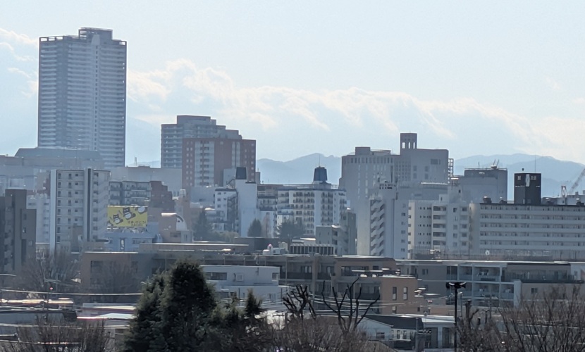 <撮影場所とおぼしき地点に行ってみた> 2-22-2026の午後、晴れていたので散歩を兼ねて白丸のスポットを訪れてみることにしました。 確率最大の白丸の地点は視界がよくないのであてがはずれました。 もう一つの白丸である歩道橋の上から撮影した写真を右に載せます。 富士山は雲に隠れ、大室山も雲かビルに隠れていると考えれば一応辻褄はあいます。でも広報の撮影地点はもっと高い場所のようです。 近くの建造物の屋上あたりがあやしいですね(笑)。 |