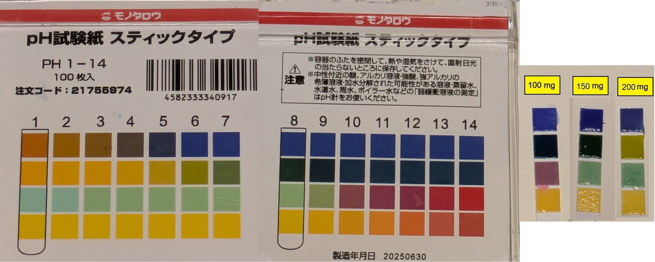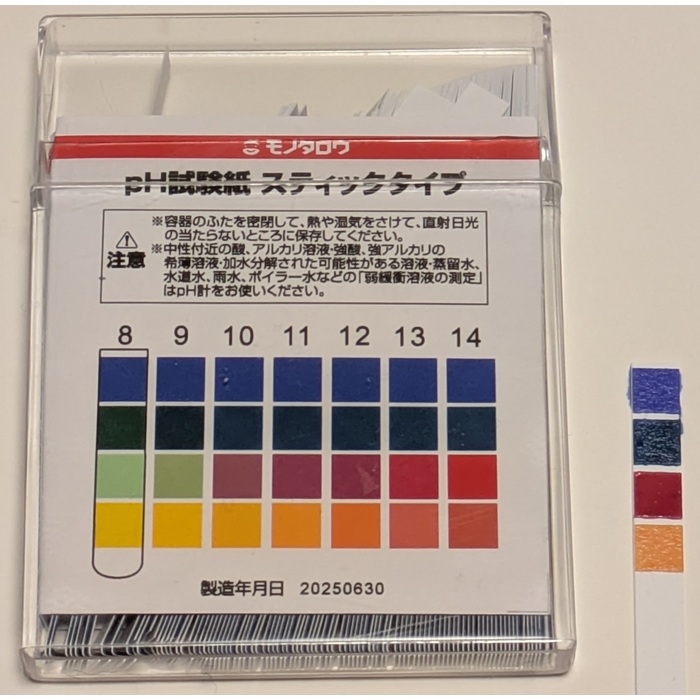 | <試験液の pH チェック> 試験液に浸したpH試験紙をスケールと比較するとpH はおよそ 11です。原液の濃度はおよそ 50×10-(14-11)mol/L=50 mmol/L と推定されます。しかし、実際はもっと濃いことが次で分かります。