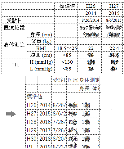 <縦・横の入れ替え> 八王子市から届く健康診査結果は縦に項目が並んでいるので、エクセルでもそれに合わせて列(column)に記入してきました。 しかしデータがたまってくると1ページに収まらなくなります。文字を小さくし、A4横で表示すればいいのですが、横にスクロールして年次変化を辿る操作はどうもしっくりこない。 そこでエクセルシートの縦と横を入れ替えることにしました。 結果を先にご覧に入れます。右図がそれです。今後新規の検査データはこちらに記入していきます。 次にこのファイルの作成手順を説明します。