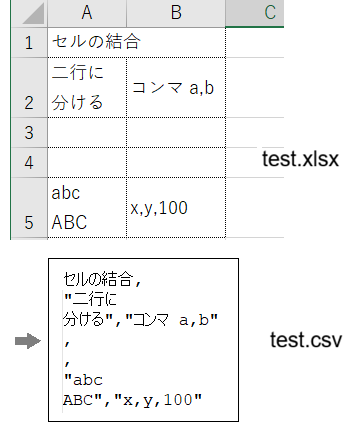 <CSVファイルの読み込み> セルの入れ替えそのものは簡単にできますが、ファイルの読み込みは一筋縄ではいきません。 文字配列変数の line をFIO.RdStr で1行ずつ読み込んだあと、line をコンマで区切って行データを 生成していくのですが、 ファイルに構造があると要注意です。右のテストデータで例を示します。 図の上は test.xlsx というエクセルファイルで(5行)、次の構造があります。