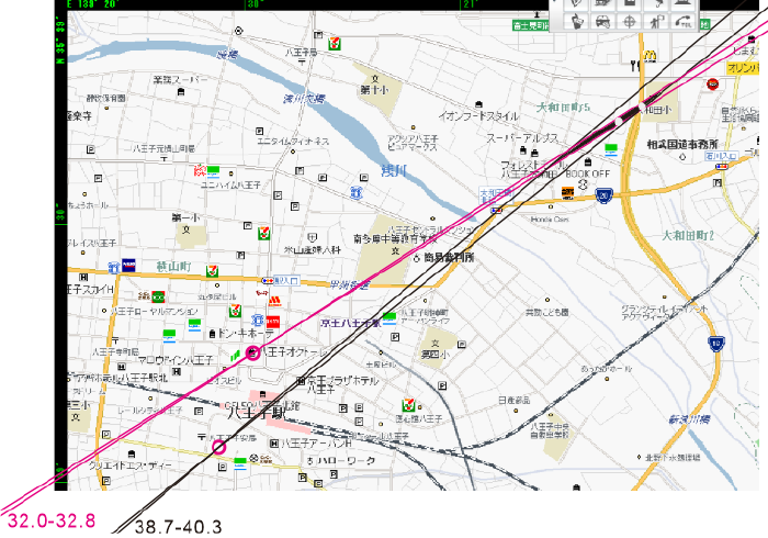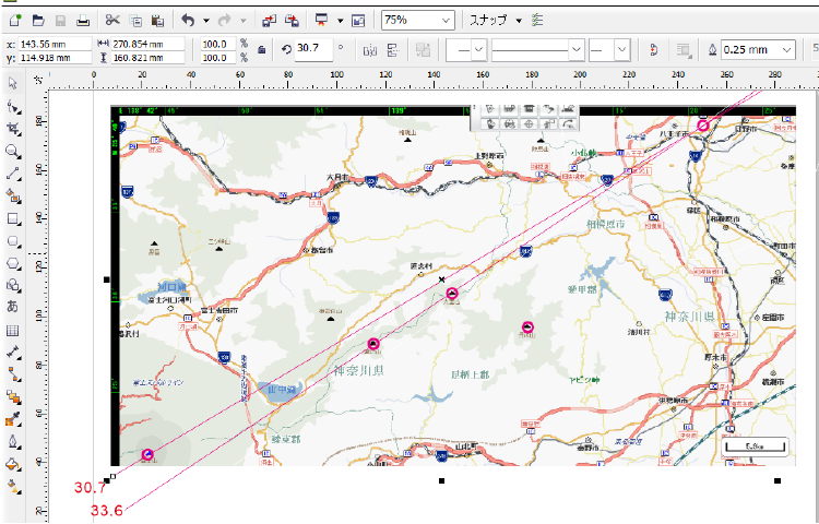 <振れ角の求め方I. 地図と描画ソフトの利用> 地図ソフト(右で用いたのは「いつもNAVI」)を起動して 撮影点と対象点の入った地図を表示させます。図では右上が八王子、左下が富士山です。 画面のスクリーンショットを取り、描画ソフト(CorelDraw)で読み込みます。撮影点と対象点の場所が分かるようにマークをつけておきます(図では〇)。 水平線(振れ角ゼロ)を引くために「グリッドにスナップ」をONにして適当なところに線を引きます。「グリッドにスナップ」をOFFにして準備完了です。 直線の角度を調整して撮影点と対象点を通る直線をみつけます。図によれば富士山(3776m)の振れ角は30.7°です。 しかし地点間隔が広がれば平面モデルが不正確になります。幸い、地図ソフトで地点の経度Θ・緯度αがわかるのでこの情報を活用しない手はありません。 |
