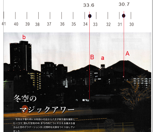<富士山の隣に見える山> 最初の写真にある対象点Bの素性を調べましょう。 富士山の地図の中に振れ角33.6°の直線が引いてあります。この直線は、八王子と大室山(1587m)を通ります。 そこで広報誌の対象点Bは大室山と仮定して話を進めます(ちなみに振れ角の計算値はβ=33.52°)。 表紙写真のAが富士山, Bが大室山として振れ角の情報を入れれば右図のように目盛が入ります。 対象点aのオクトーレはβ=32.4±0.4°、対象点bのスカイタワーはβ=39.5±0.8°と見積もられます。 |