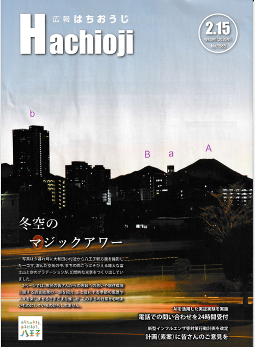 <広報紙の表紙> 右図は八王子市広報の表紙です (2026年2月15日号)。夕方、大和田小学校付近から八王子駅の方角(西南西)を撮影したとのことです。これを見てこんなことを考えました。