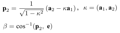 <振れ角の求め方II. 経度・緯度から計算によって> Pを撮影点(位置ベクトルa1)、Qを対象点(位置ベクトルa2)とします。位置ベクトルはΘとαから容易に計算できます。 Pにおける接線は、Pにおける接平 面(撮影者にとっては地面)に乗っていますからPにおける東西のベクトルeと接線が作る角度βが振れ角になります。