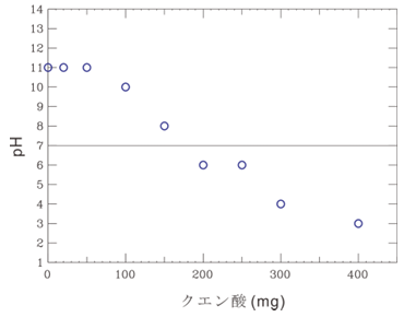 クエン酸が 100, 150, 200 mg と増えると pH は 10, 8, 6 と減少します。